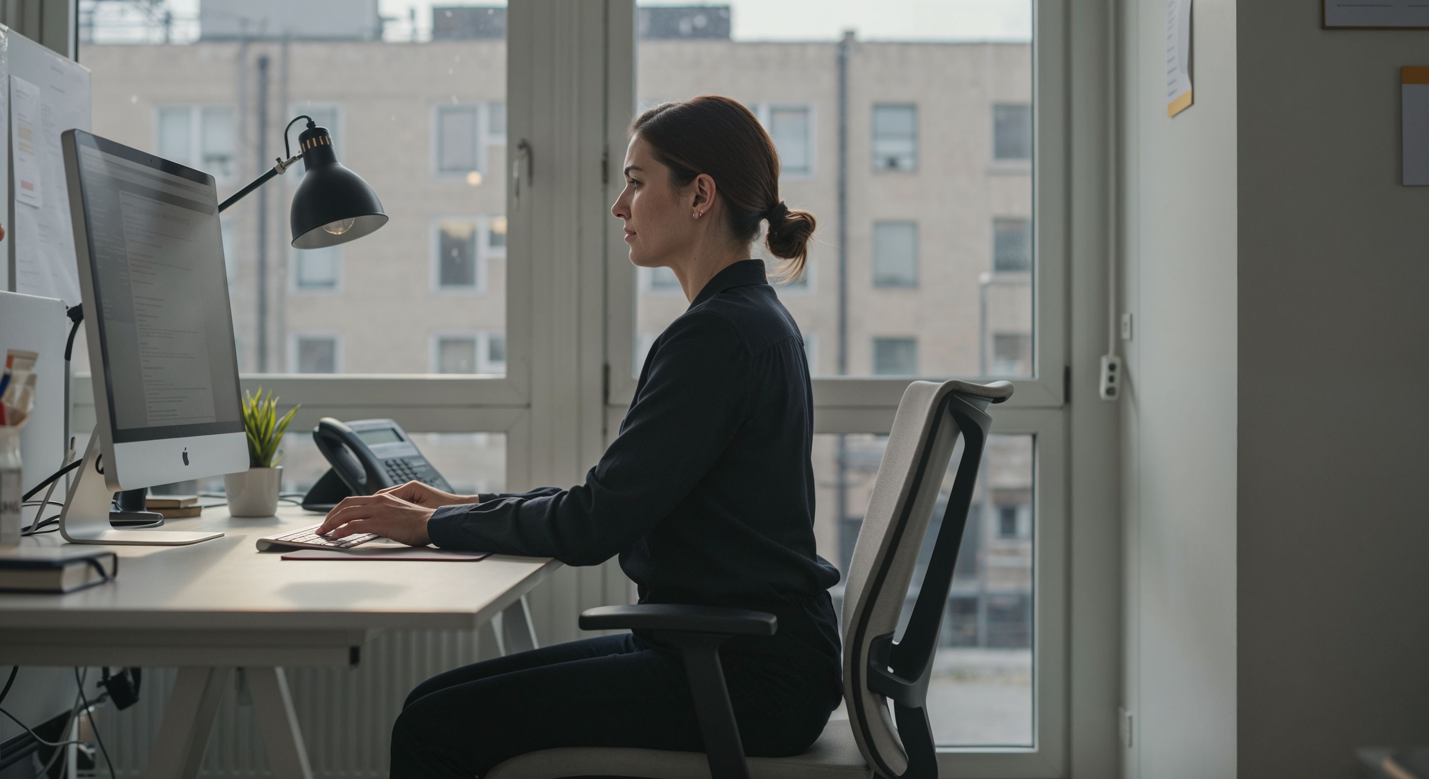 Si trabajas frente al ordenador, asegúrate de que la pantalla esté a la altura de tus ojos y a unos 50-70 cm de distancia. Los hombros deben estar relajados y los codos formar un ángulo de 90 grados. Realiza pausas cada hora para mover el cuello y estirar la musculatura.